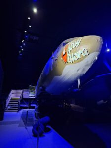 Daarna gingen we naar het laatste onderdeel van de D-Day Experience: de simulator. We kwamen terecht in Engeland in 1944. We waren paratroupers die in afwachting waren van het moment dat we zouden vertrekken naar Normandië. In een 3-d hologram werd ons verteld wat we meenamen in onze parachutesprong, waar het voor diende en wat er we ermee moesten doen. Aan het eind van de uitleg werd ons verteld dat het moment was aangebroken om te vertrekken. We werden een C47 vliegtuig ingeleid waar we plaats moesten nemen op een bank. Gordels om en het vliegtuig vertrok.